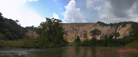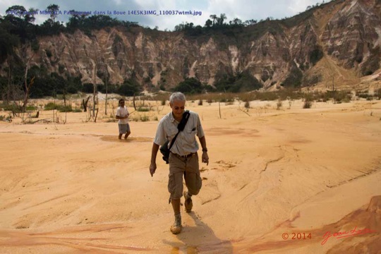 Puis au milieu de la forêt qui s'éclairci lentement, au fur et à mesure qu'on se rapproche d'une large courbe de la rivière, on voit apparaître au milieu des arbres, une tache rougeâtre qui est le Canyon MBIÉ. On laisse la pirogue sur le bord du fleuve, bien attachée à un arbre et nous sautons à terre. On marche sur seulement une centaine de mètres pour déboucher sur un vaste lac de terre et de sable rose. L'effondrement d'une partie de la colline a créé ce désert de boue. Les flancs de la colline doivent glisser de temps en temps, au gré des grosses pluies. Ceci explique que ce canyon est en pleine vie et évolue constamment, contrairement aux canyons près de Leconi, qui eux semblent évoluer très lentement. Les flancs de ce canyon, n'ont que très peu de forêt ou d'arbustes. Il n'y a que de la terre dénudée. A la base, un spectacle lunaire s'offre à nous. Des troncs d'arbres morts pointent vers le ciel, comme des lances disposées par des géants pour soutenir la voute céleste. Nous pénétrons dans ce lac. Et là, nous nous embourbons dans cette vase, dont par endroit la hauteur atteint le genou. Ce mélange visqueux happe nos pieds et nos chaussures. On s'enfonce, on tire sur le pied pour retomber avec difficulté devant. Je cherche un endroit plus solide, je reviens en arrière. J'essaye de trouver une autre partie sans ces sables mouvants. Je passe sur les bords et mon pied ne s'enlise pas totalement. Je continue donc. Tout cela pour avancer de quelques mètres. En fait on ne s'envase pas au-delà du genou. On peut donc continuer.