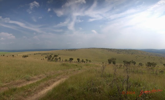 • Du campement, on monte sur un Quad avec une benne, qui nous permet de suivre une piste qui s'éloigne progressivement de la forêt. Nous pénétrons alors dans cette savane arbustive, ou des arbres clairsemés apparaissent tous les 10 à 15 mètres. On doit naviguer pour passer entre ces arbres. Quelquefois, les arceaux s'accrochent à un arbre et on est obligé de faire marche arrière et de passer en dehors de la piste. Il est évident qu'il faudra dans le futur, amener une équipe pour nettoyer le passage, sinon, dans quelques mois, on ne pourra plus passer. La forêt est en train de gagner sur la savane. On serpente entre les collines, puis on monte, on redescend, on remonte. Cette piste passe aux sommet de collines qui nous offrent un panorama extraordinaire. A perte de vue, la savane, les arbustes, les collines. Un paysage grandiose.